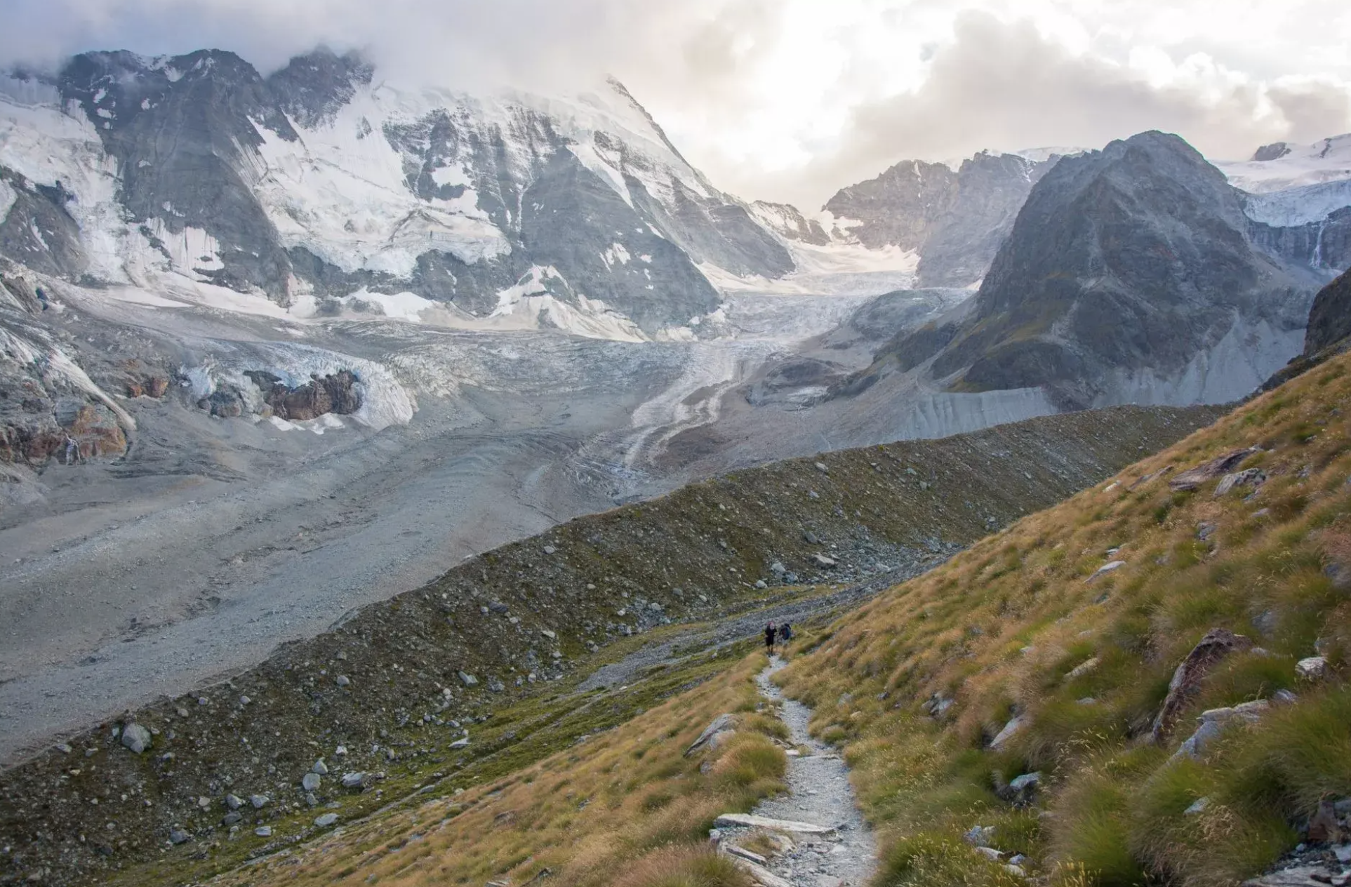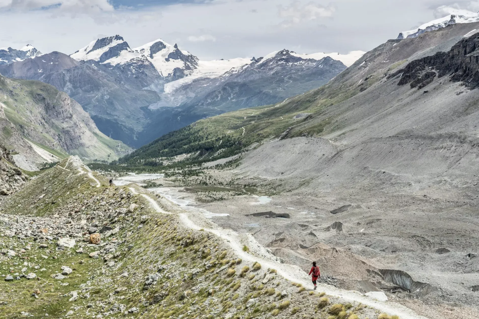 Caminarás por la cresta de la morrena lateral del Glaciar Zmutt, sintiendo bajo tus pies la fuerza geológica que dio forma a Suiza. Es un tramo de pura conexión con la alta montaña, donde el silencio solo lo rompe el viento y el crujir lejano del hielo.